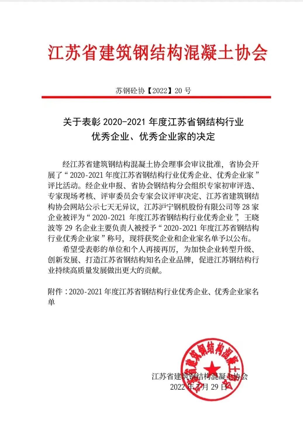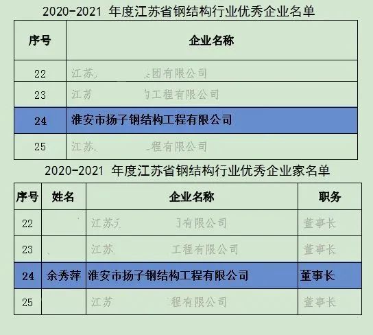 七月的驕陽熱情似火,七月的花海流溢飄香?;窗彩袚P(yáng)子鋼結(jié)構(gòu)工程有限公司(以下簡稱“揚(yáng)子鋼構(gòu)”)全體員工懷著無比激動(dòng)的心情,迎來了盼望已久的喜訊——淮安揚(yáng)子鋼構(gòu)被江蘇省建筑鋼結(jié)構(gòu)混凝土協(xié)會(huì)評為“2020-2021年度江蘇省鋼結(jié)構(gòu)行業(yè)優(yōu)秀企業(yè)”,董事長余秀萍被授予“2020-2021年度江蘇省鋼結(jié)構(gòu)行業(yè)優(yōu)秀企業(yè)家”稱號。