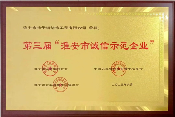 近日,淮安市揚子鋼結(jié)構(gòu)工程有限公司(以下簡稱“揚子鋼構(gòu)”)在2022年度市級誠信示范企業(yè)申報認定活動中,榮獲第三屆“淮安市誠信示范企業(yè)”稱號。