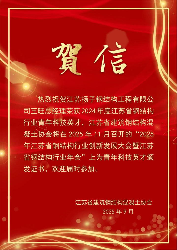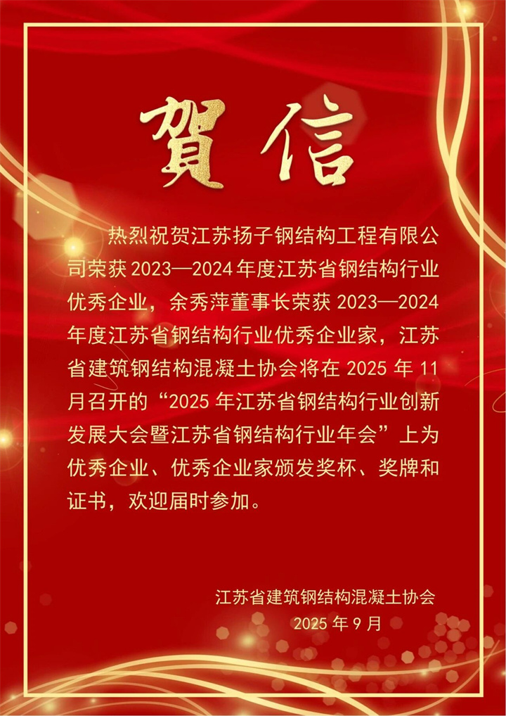 熱烈慶祝我司榮獲2023-2024年度江蘇省鋼結構協(xié)會優(yōu)秀企業(yè),我司余秀萍董事長榮獲省鋼結構行業(yè)優(yōu)秀企業(yè)家,我司王旺總經(jīng)理榮獲省鋼結構行業(yè)青年科技英才。這不僅是公司的榮譽,更是揚子每位員工的驕傲,期待未來繼續(xù)并肩前行,再創(chuàng)佳績,續(xù)寫更多精彩。